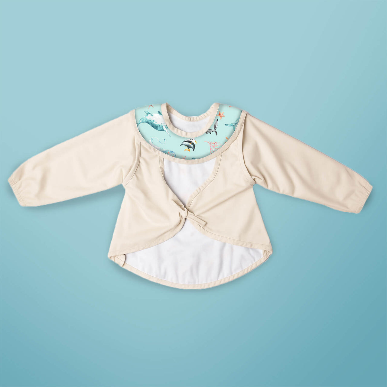 The Smocket is a full-sleeve bib (a.k.a smock) with a crumb catcher on the front (or pocket). It is designed to hold all the mess your kid can throw at it, which means less crap for you to deal with.