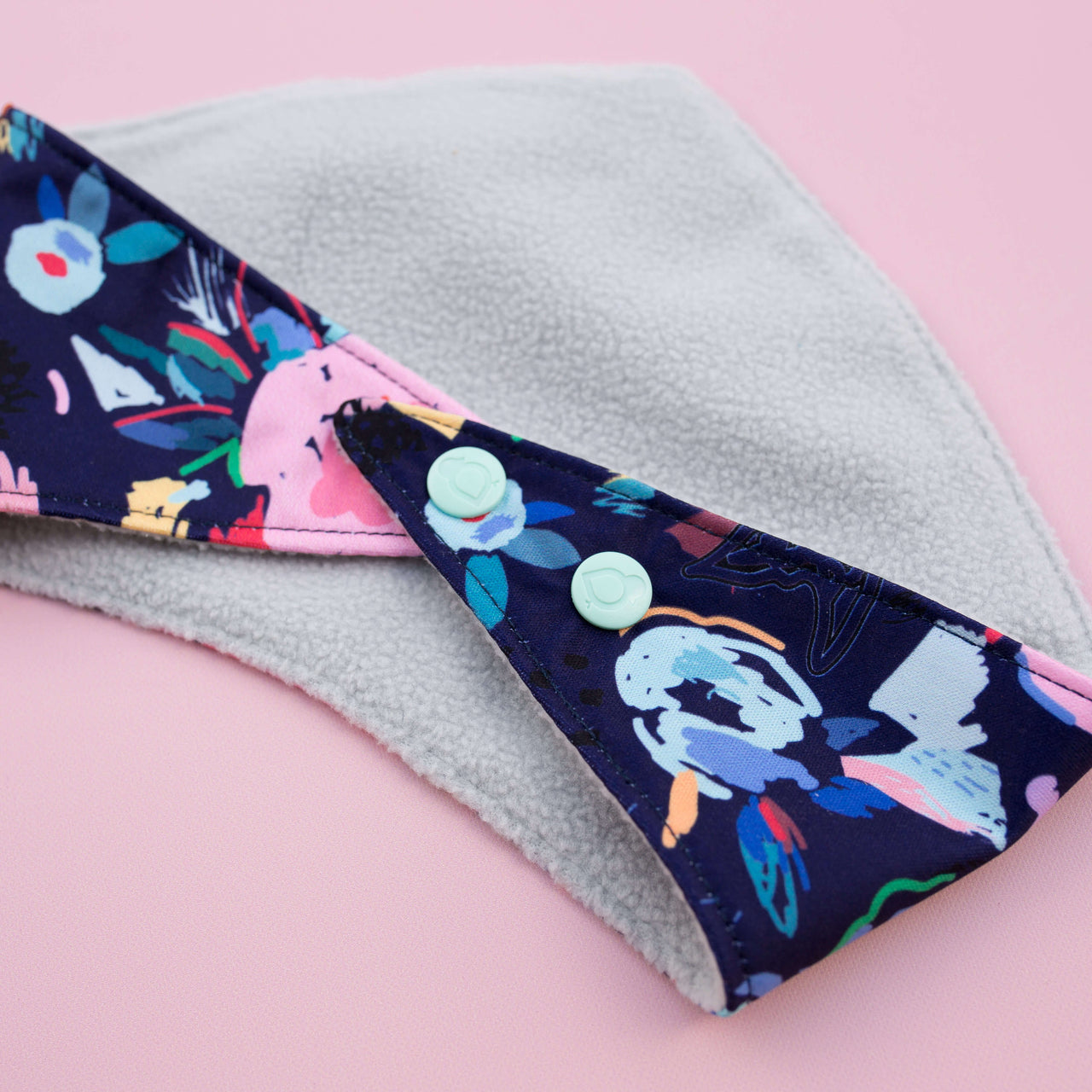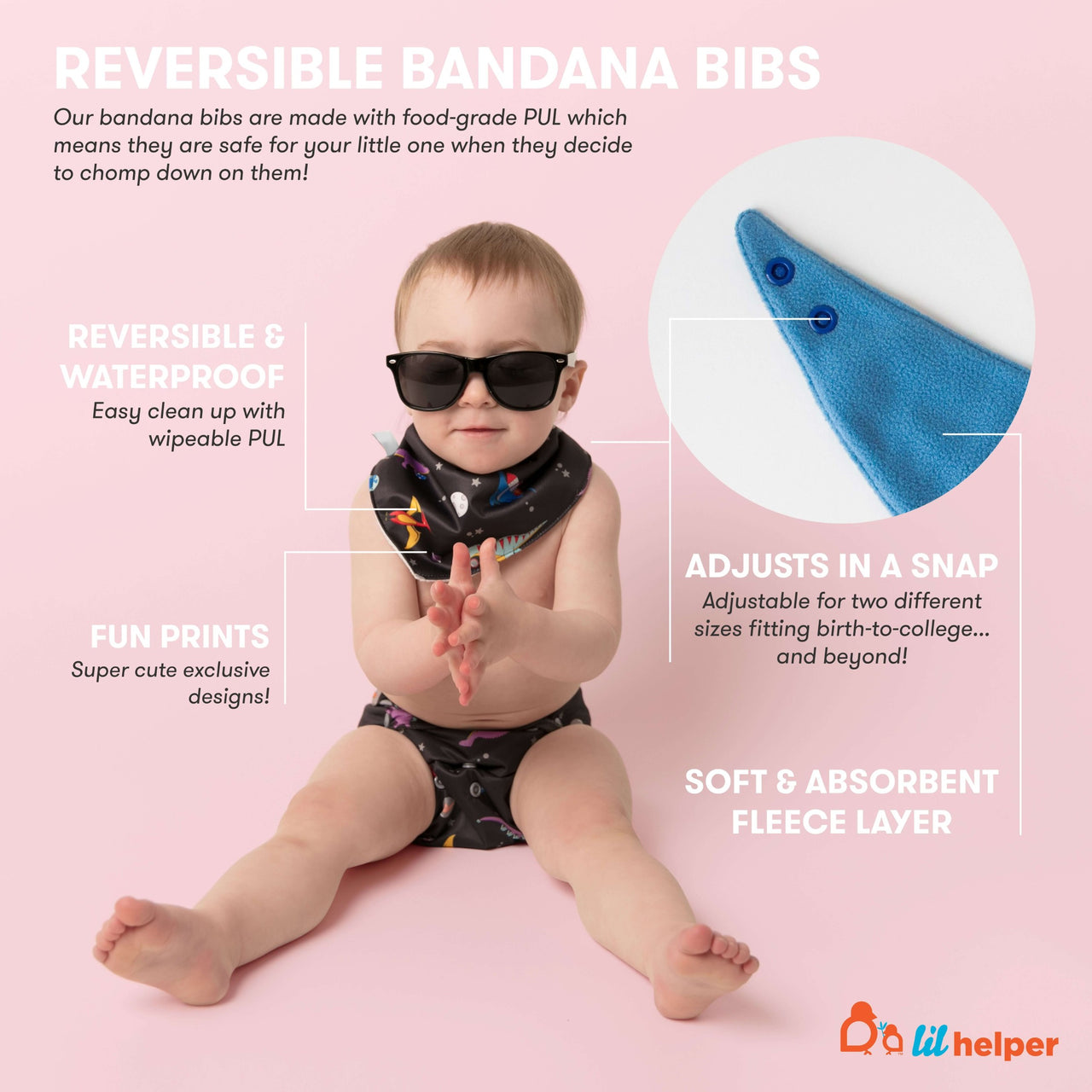 Keep your baby stylish and dry with this reversible bandana bib. Soft fleece absorbs drool, while the PUL side wipes clean. Adjustable snaps for a perfect fit.