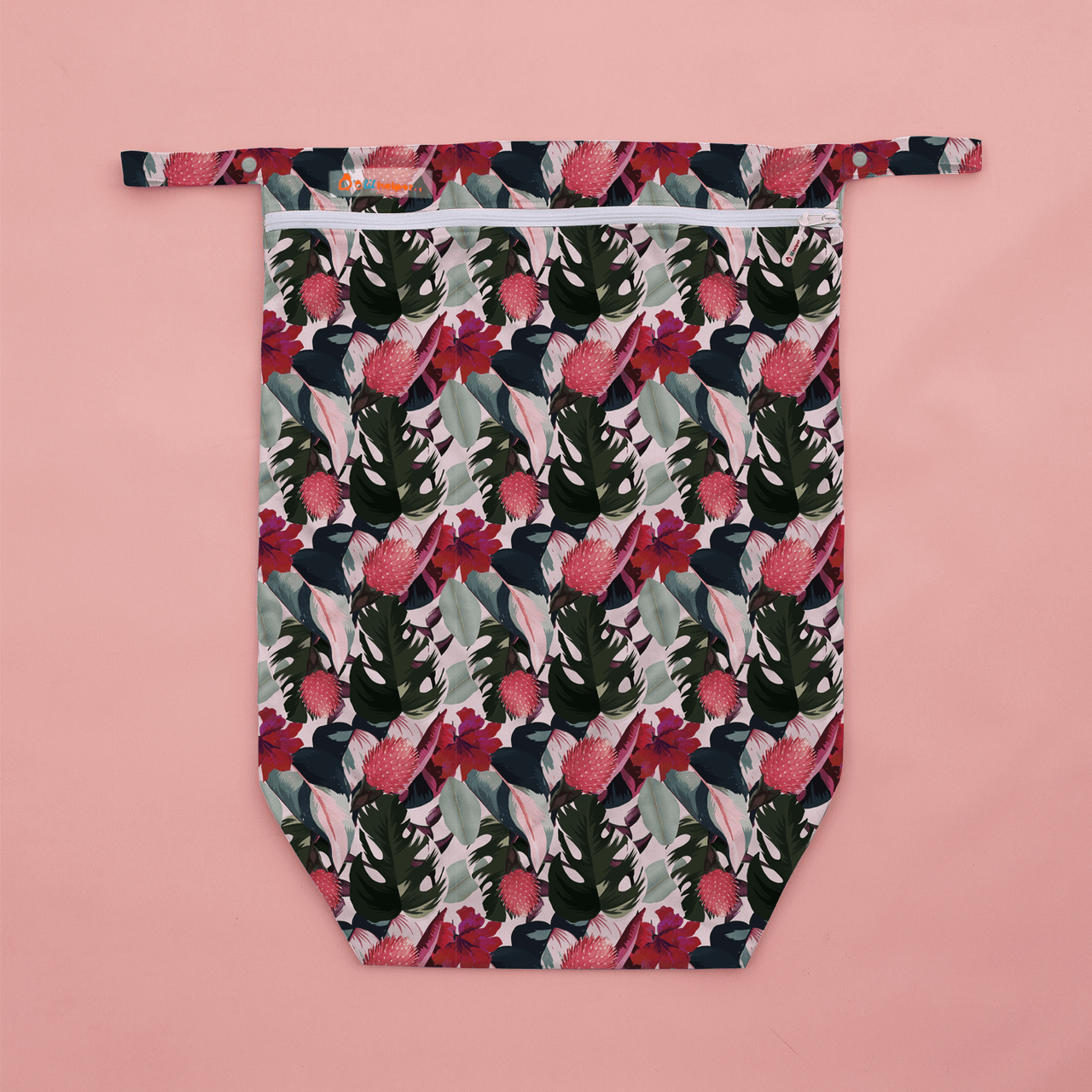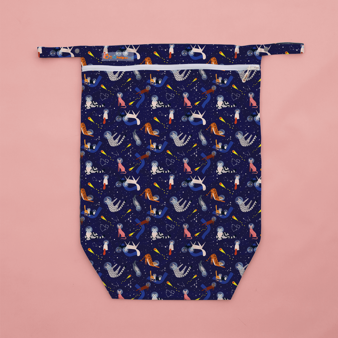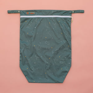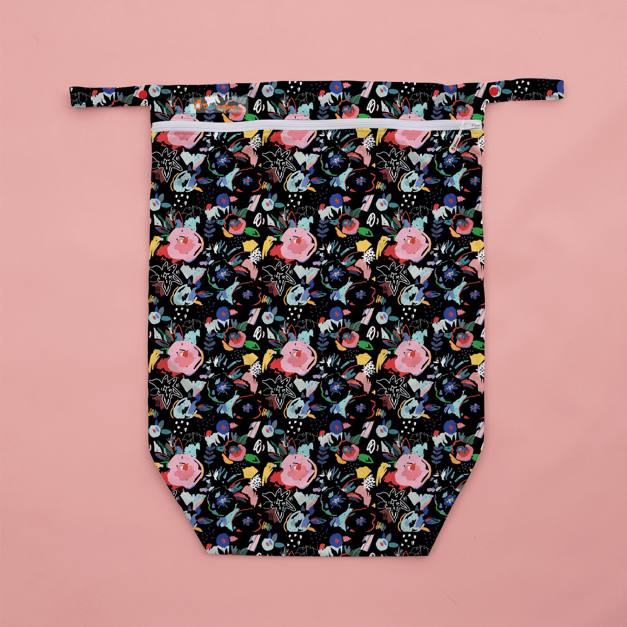 Our wet bag is made of the same resilient, waterproof PUL that is used for our cloth diapers. When we say waterproof, we essentially mean that the bag won't leak if you happen to put in stuff that is "moisture laden". This means that no matter what your diapers or other gear are soaked in, you won’t need to worry about anything spreading.